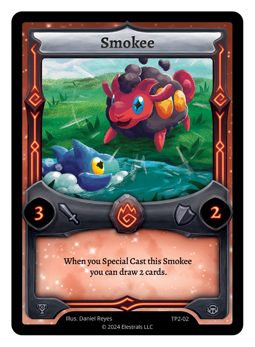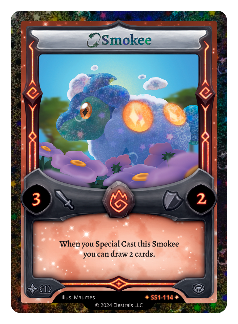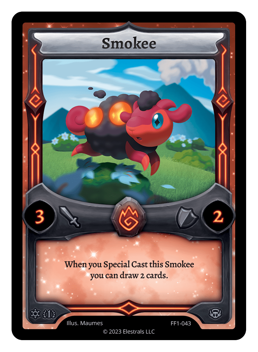 Smokee❮❯❮❯❮❯FF1-043SS1-114TP2-02TypeElestralCostFireElementsFireAttack3Defense2Card TextWhen you Special Cast this Smokee you can draw 2 cards.SubclassesEthereal