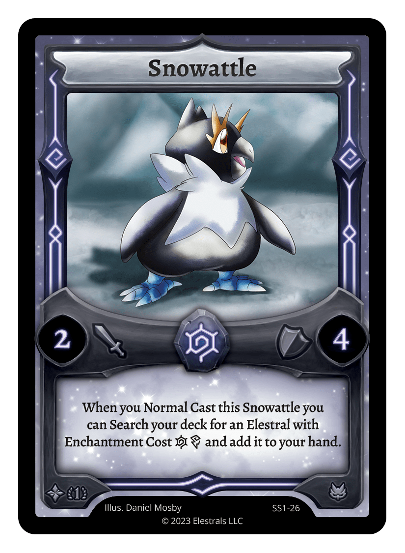 Snowattle❮❯❮❯❮❯❮❯❮❯SD07-01XX/99FF1-012SS1-27SS1-26TypeElestralCostFrostElementsFrostAttack2Defense4Card TextWhen you Normal Cast this Snowattle you can Search your deck for an Elestral with Enchantment Cost {IT} and add it to your hand.SubclassesAvian