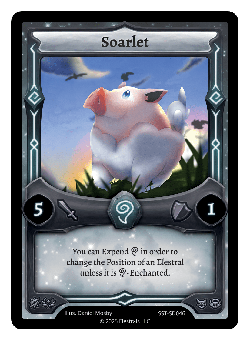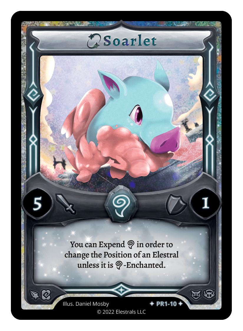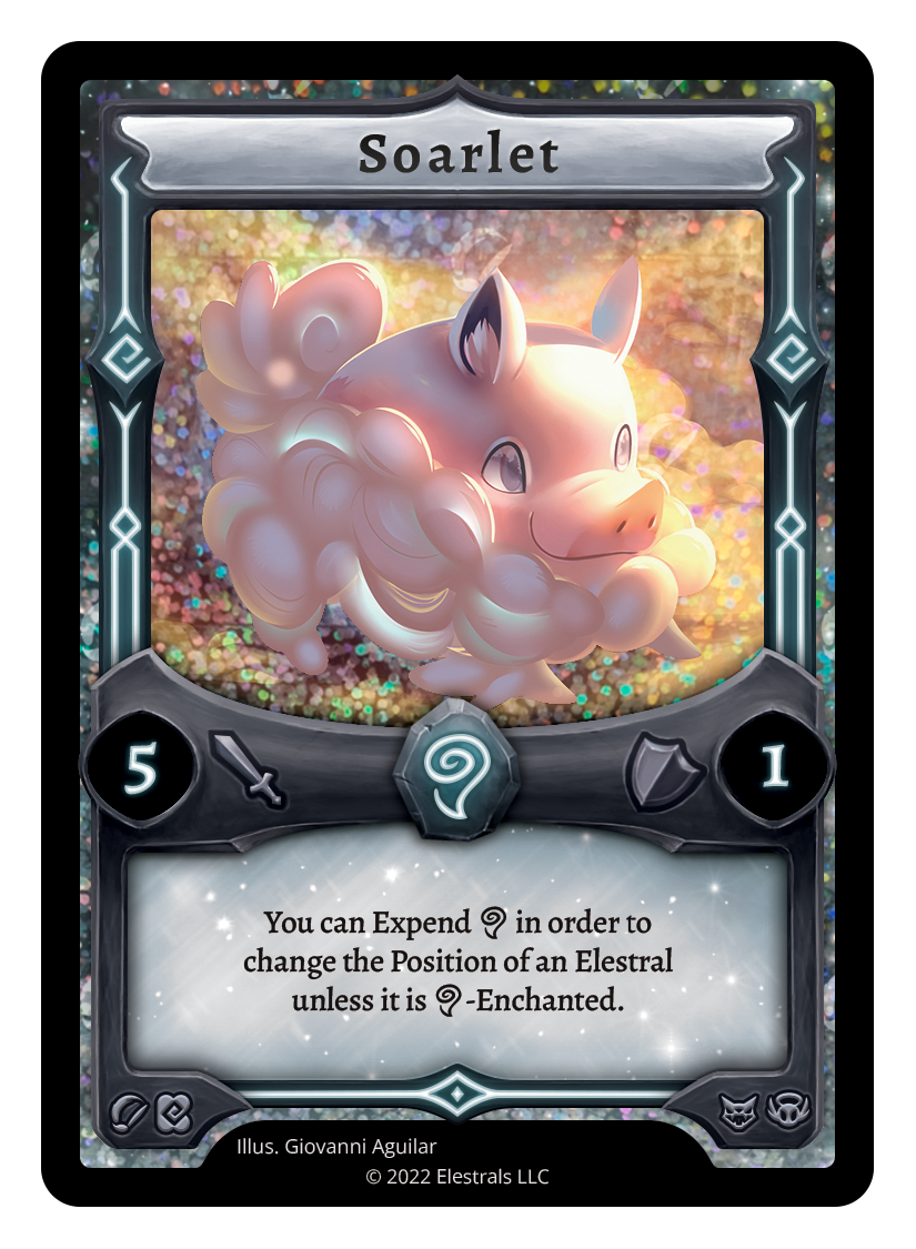 Soarlet❮❯❮❯❮❯❮❯❮❯❮❯❮❯❮❯SD05-08PR1-10AC1-09BS1-076BS1-076SD05-08SD07-11SST-SD046TypeElestralCostWindElementsWindAttack5Defense1Card TextYou can Expend {A} in order to change the Position of an Elestral unless it is {A}-Enchanted.SubclassesBruteEthereal