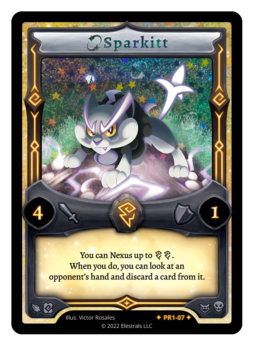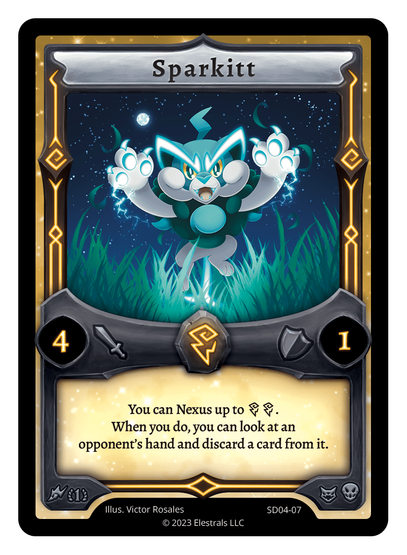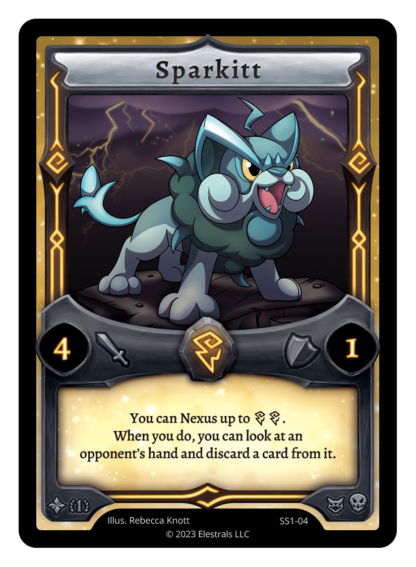 Sparkitt❮❯❮❯❮❯❮❯❮❯❮❯BS1-061PR1-07BS1-061SS1-04SD04-07SD04-07TypeElestralCostThunderElementsThunderAttack4Defense1Card TextYou can Nexus up to {TT}. When you do, you can look at an opponent's hand and discard a card from it.SubclassesBruteArchaic