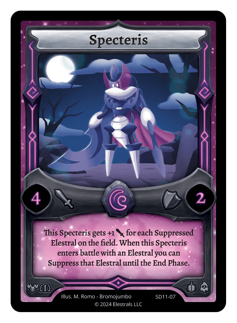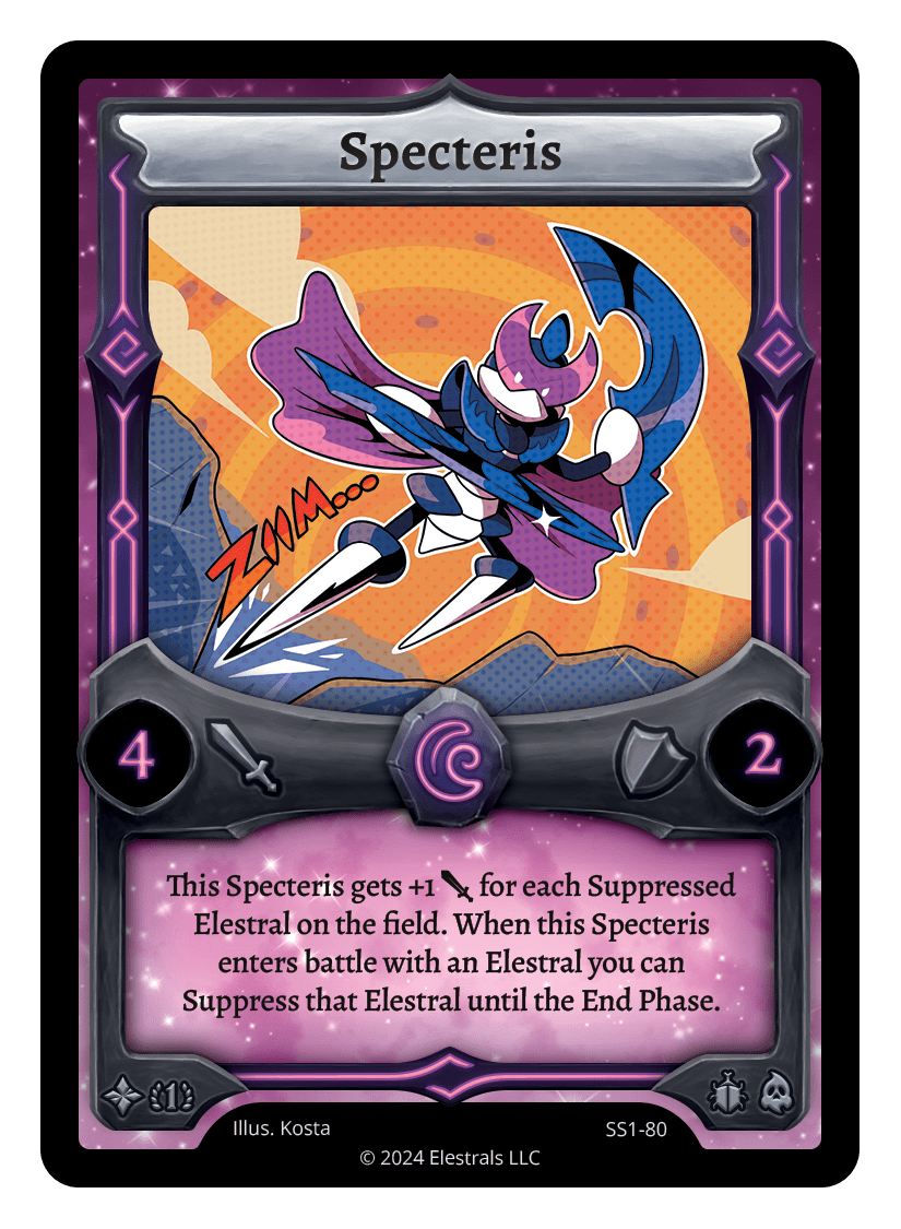 This Specteris gets +1 {J} for each Suppressed Elestral on the field. When this Specteris enters battle with an Elestral you can Suppress that Elestral until the next turn.