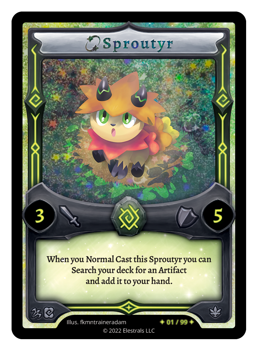Sproutyr❮❯❮❯❮❯❮❯❮❯SD01-01AC1-16SS1-46XX/99SD01-01TypeElestralCostEarthElementsEarthAttack3Defense5Card TextWhen you Normal Cast this Sproutyr you can Search your deck for an Artifact Rune and add it to your hand.SubclassesDryad