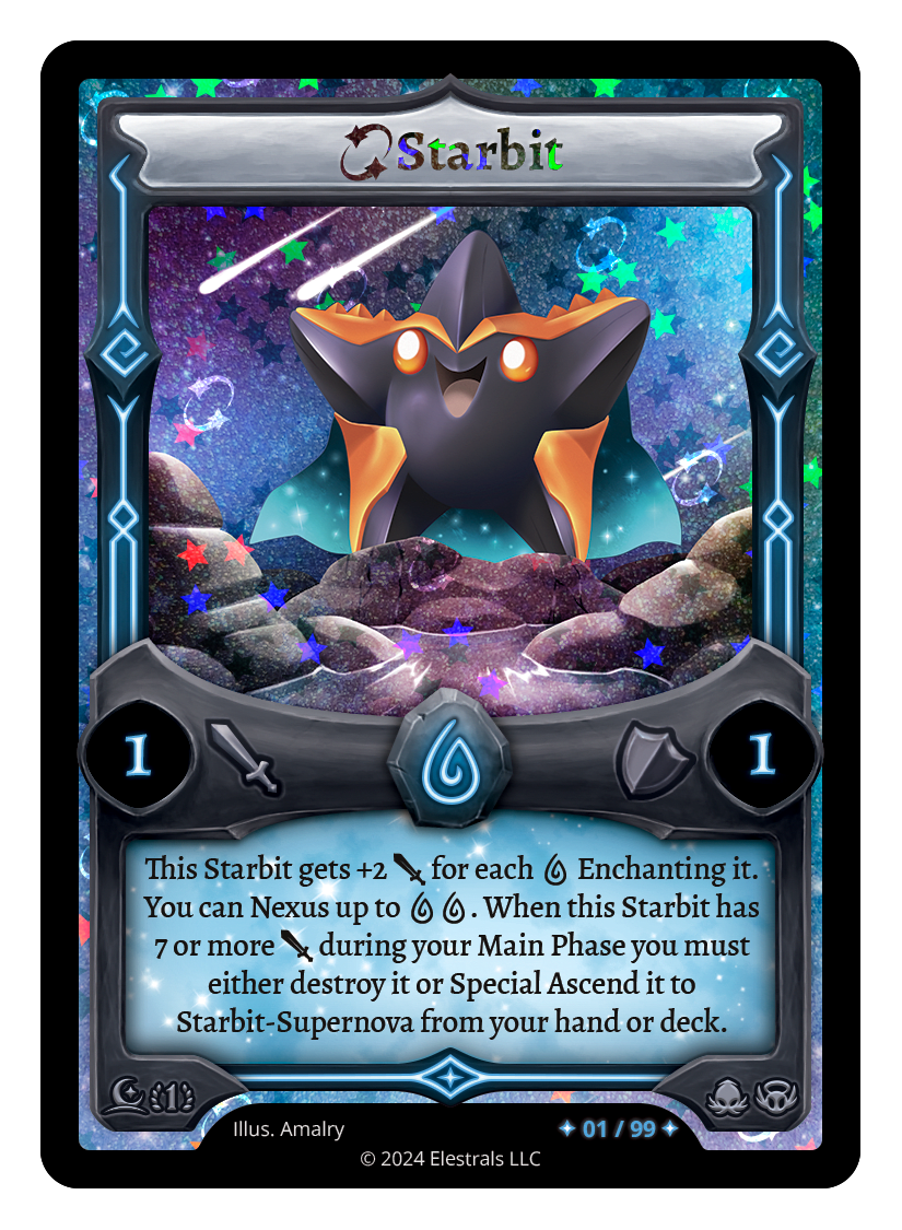 This Starbit gets +2 {J} for each {W} Enchanting it. You can Nexus up to {WW}. When this Starbit has 7 or more {J} during your Main Phase you must either destroy it or Special Ascend it to Starbit-Supernova from your hand or deck.