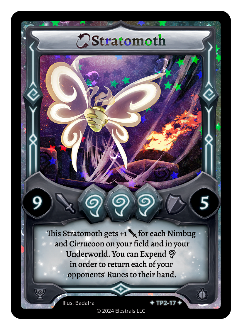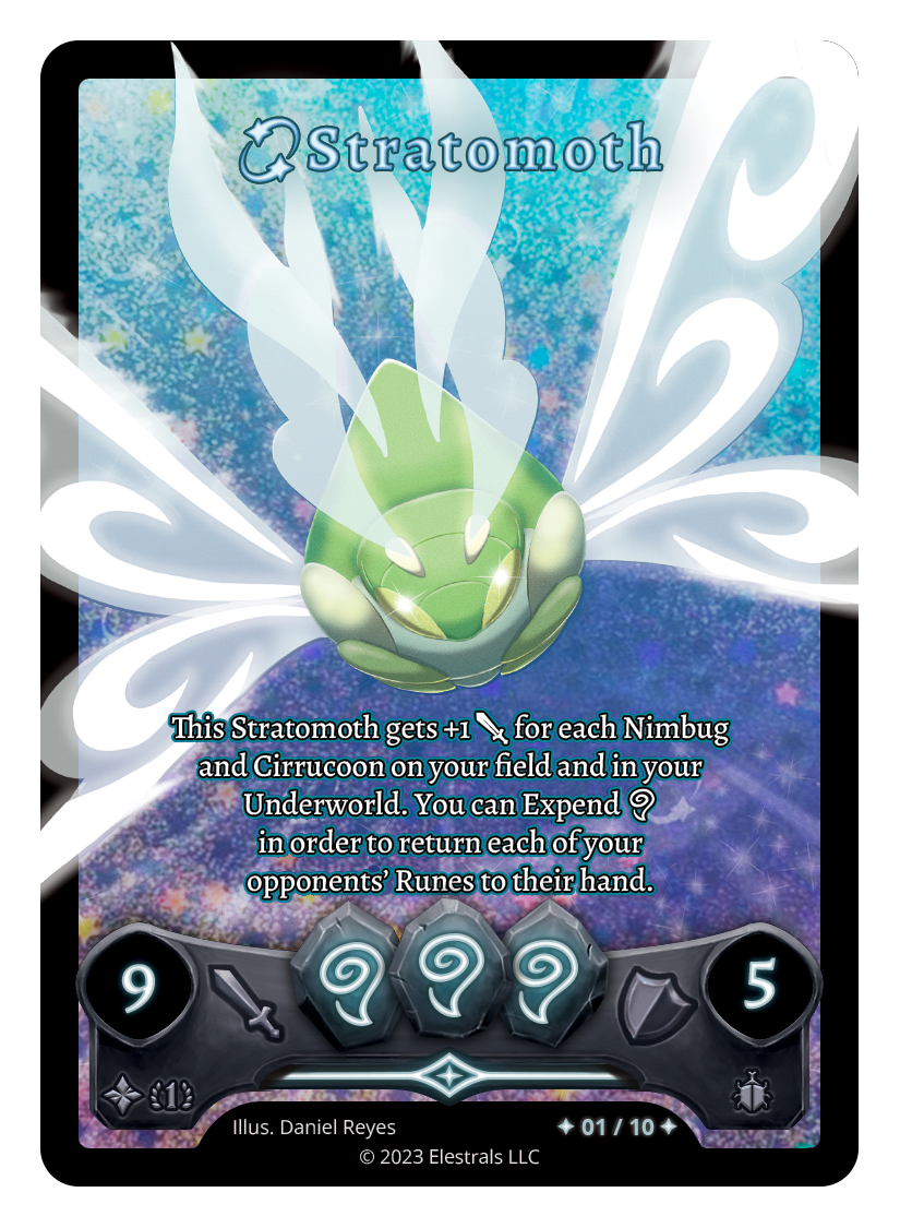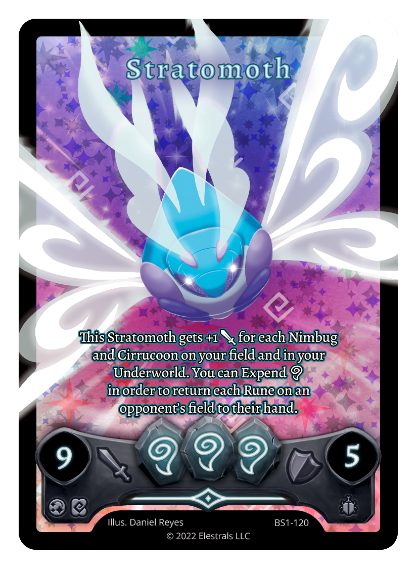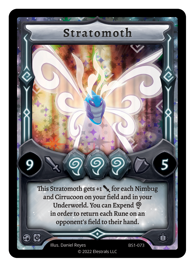 This Stratomoth gets +1 {J} for each Nimbug and Cirrucoon on your field and in your Underworld. You can Expend {A} in order to return each of your opponents' Runes to their hand.