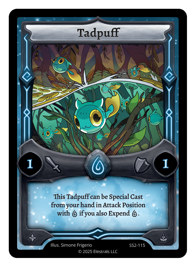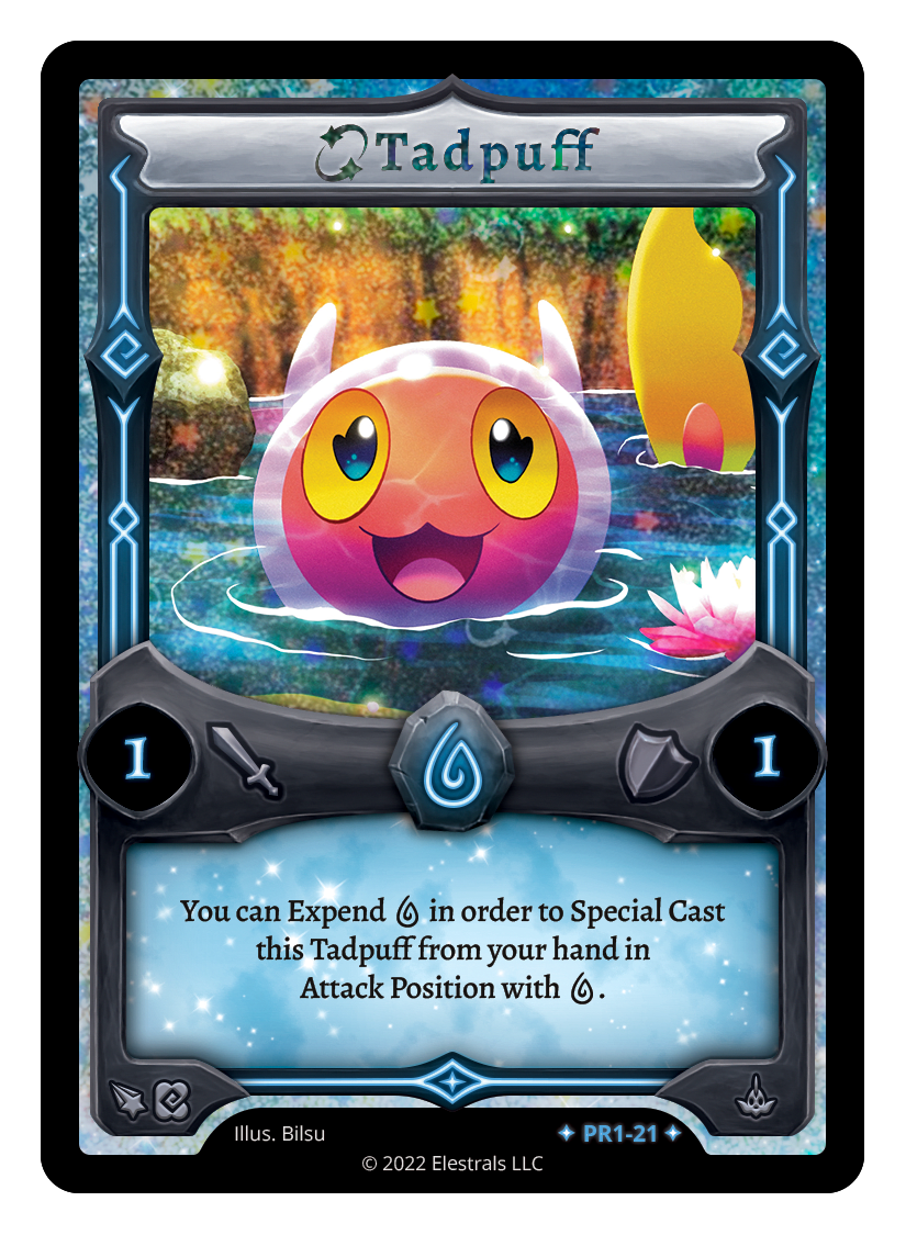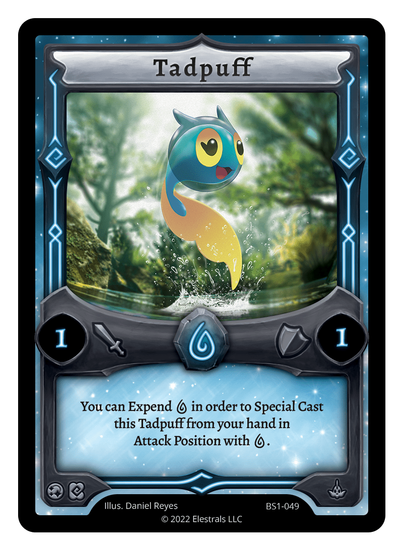 Tadpuff❮❯❮❯❮❯❮❯❮❯PR1-21BS1-049BS1-049SD08-06SS2-115TypeElestralCostWaterElementsWaterAttack1Defense1Card TextThis Tadpuff can be Special Cast from your hand in Attack Position with {W} if you also Expend {W}.SubclassesAquatic