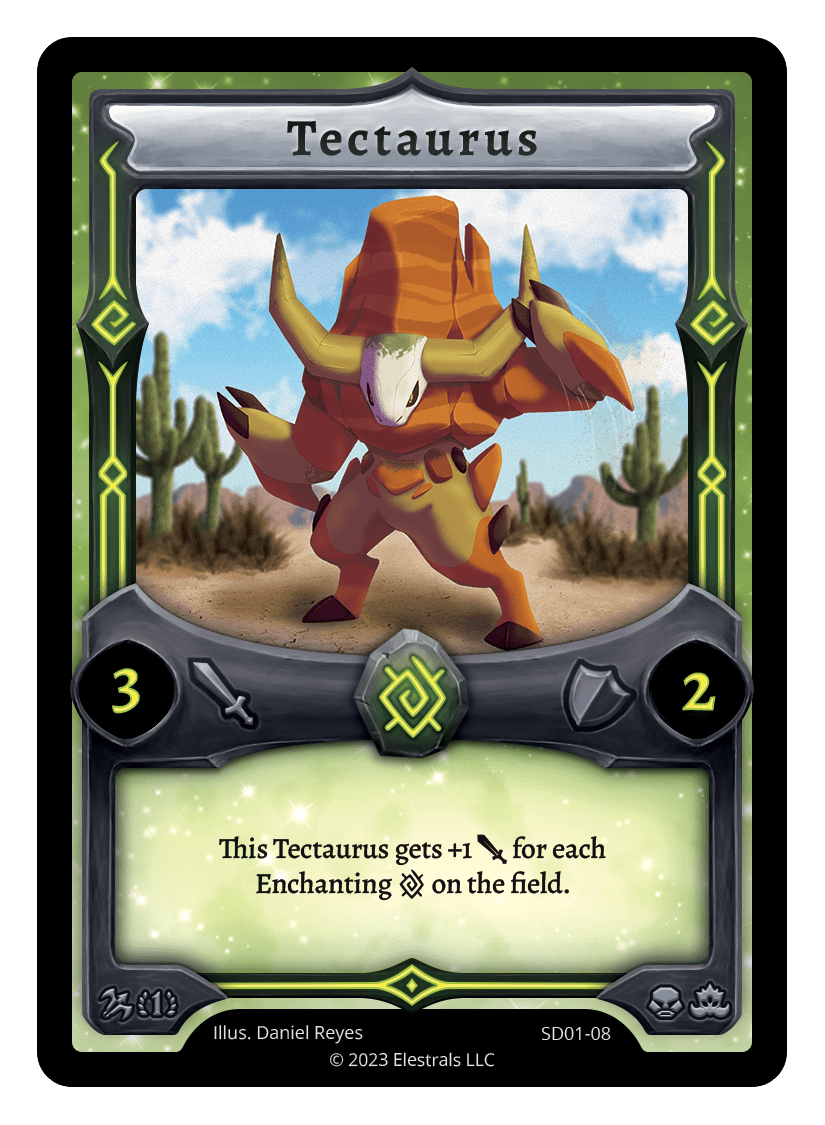 Tectaurus❮❯❮❯❮❯❮❯❮❯❮❯BS1-014AC1-23BS1-014SD01-08XX/99SD01-08TypeElestralCostEarthElementsEarthAttack3Defense2Card TextThis Tectaurus gets +1 {J} for each Enchanting {E} on the field.SubclassesGolemBehemoth