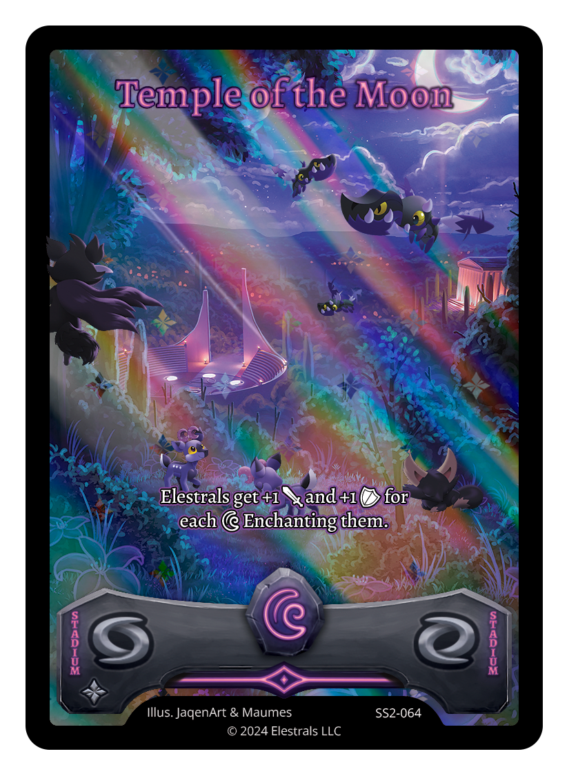 Temple of the Moon❮❯❮❯❮❯❮❯❮❯MR1-084SD10-18SD11-17SS2-064LST-SD088TypeRuneStadiumCostLunarElementsLunarCard TextElestrals get +1 {J} and +1 {O} for each {D} Enchanting them.