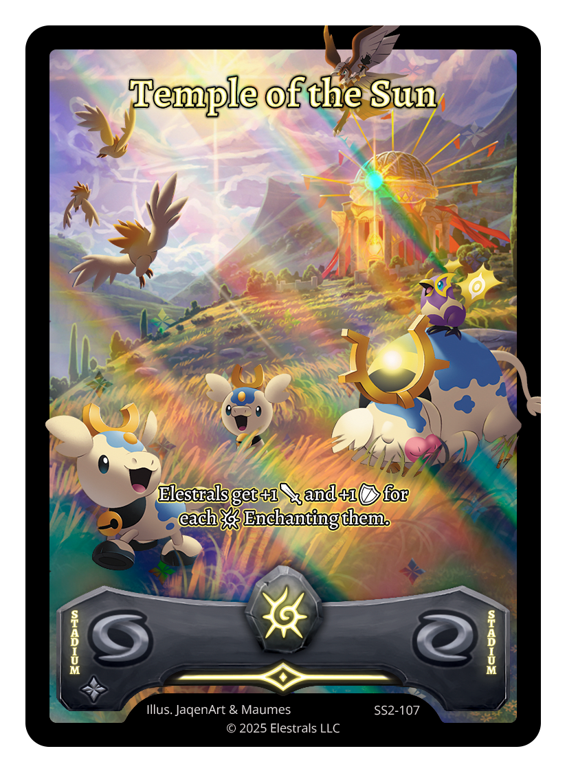 Temple of the Sun❮❯❮❯❮❯SD09-16DB1-070SS2-107TypeRuneStadiumCostSolarElementsSolarCard TextElestrals get +1 {J} and +1 {O} for each {L} Enchanting them.