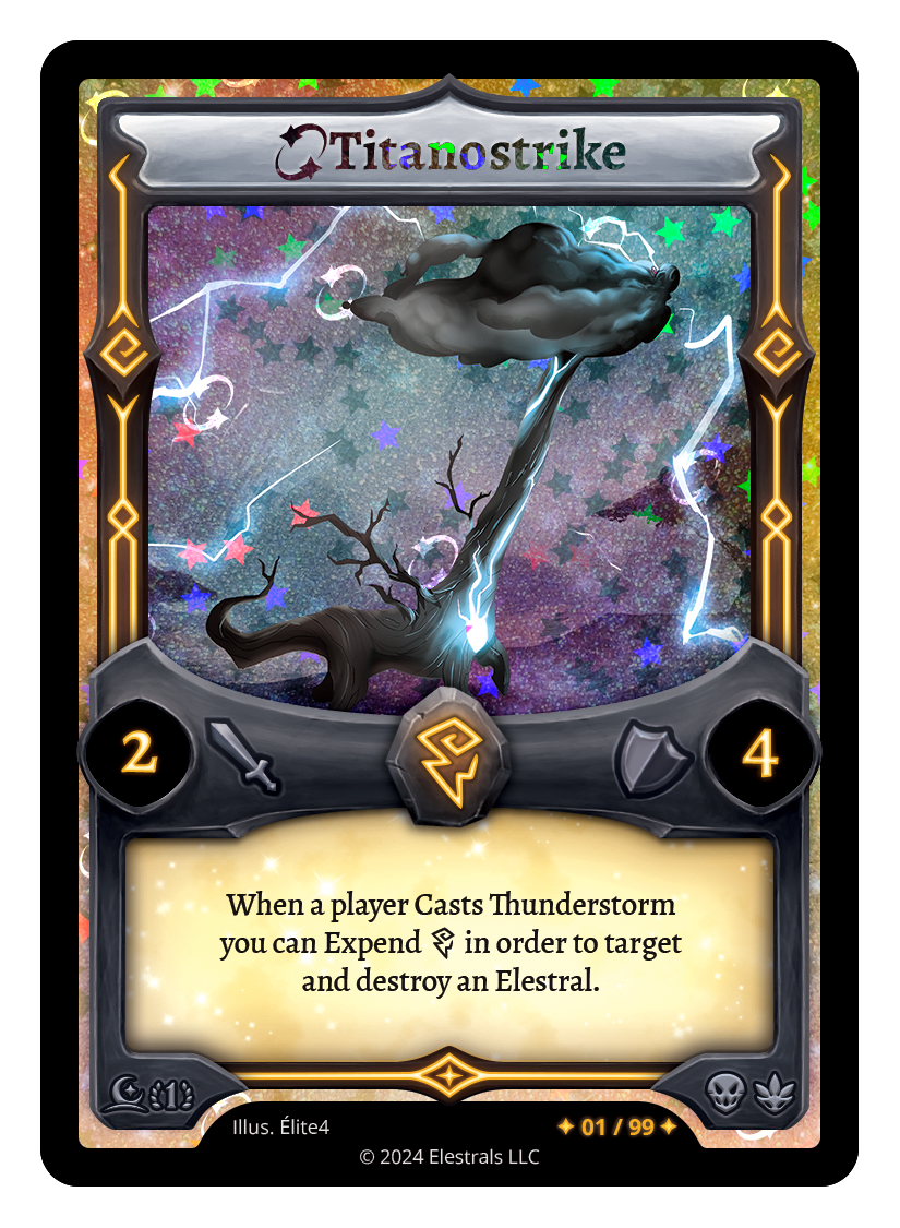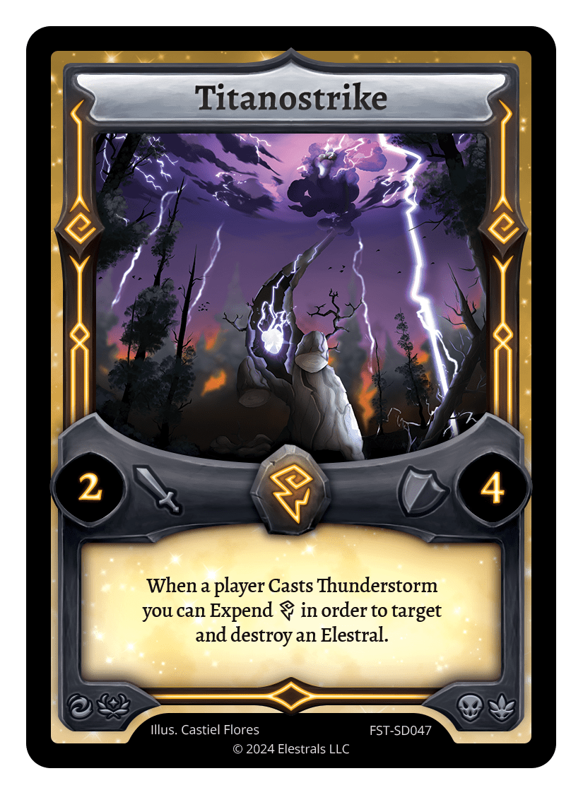 Titanostrike❮❯❮❯❮❯❮❯SS2-006MR1-056XX/99FST-SD047TypeElestralCostThunderElementsThunderAttack2Defense4Card TextWhen a player Casts Thunderstorm you can Expend {T} in order to target and destroy an Elestral.SubclassesArchaicDryad