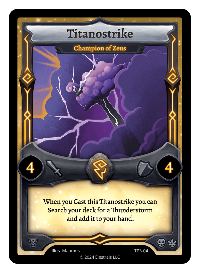 Titanostrike - Champion of Zeus❮❯❮❯❮❯❮❯FST-R04FST-041TP3-04FST-SD039TypeElestralCostThunderElementsThunderAttack4Defense4Card TextWhen you Cast this Titanostrike you can Search your deck for a Thunderstorm and add it to your hand.SubclassesArchaicDryad