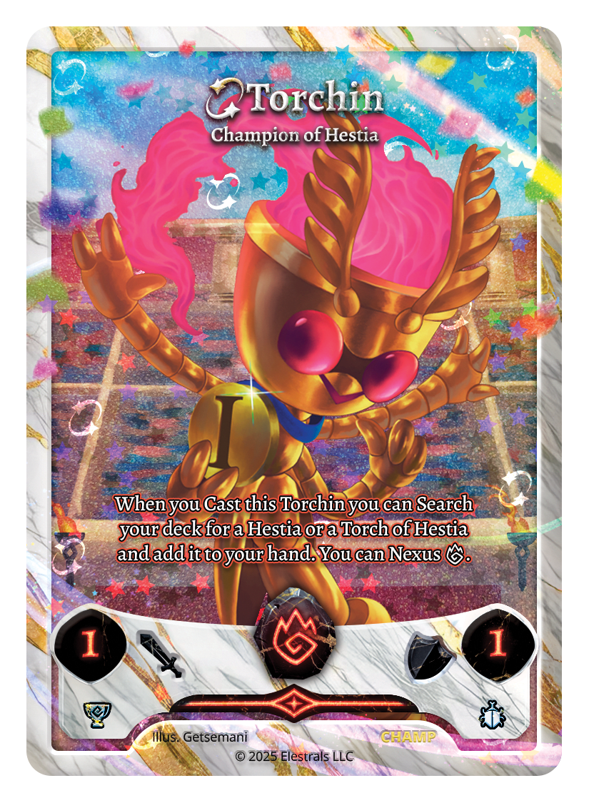 Torchin - Champion of Hestia❮❯❮❯❮❯❮❯❮❯❮❯FST-025FST-098FST-SD017TP3-16CHAMPXX/10TypeElestralCostFireElementsFireAttack1Defense1Card TextWhen you Cast this Torchin you can Search your deck for a Hestia or a Torch of Hestia and add it to your hand. You can Nexus {F}.SubclassesInsectoid