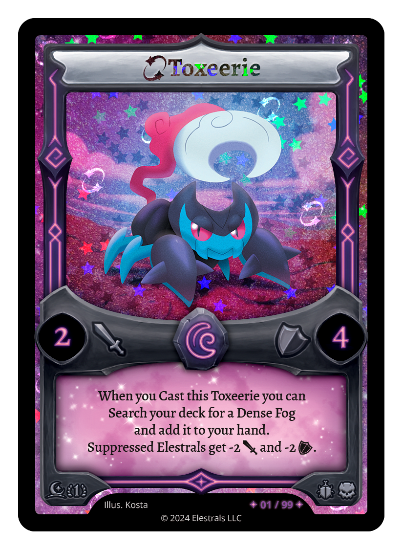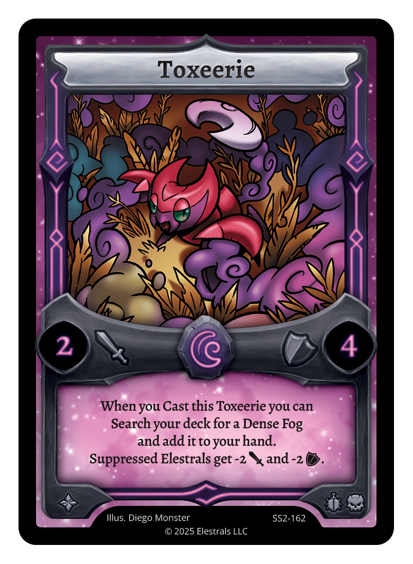 Toxeerie❮❯❮❯❮❯❮❯MR1-022XX/99SD11-05SS2-162TypeElestralCostLunarElementsLunarAttack2Defense4Card TextWhen you Cast this Toxeerie you can Search your deck for a Dense Fog and add it to your hand. Suppressed Elestrals get -2 {J} and -2 {O}.SubclassesInsectoidEldritch