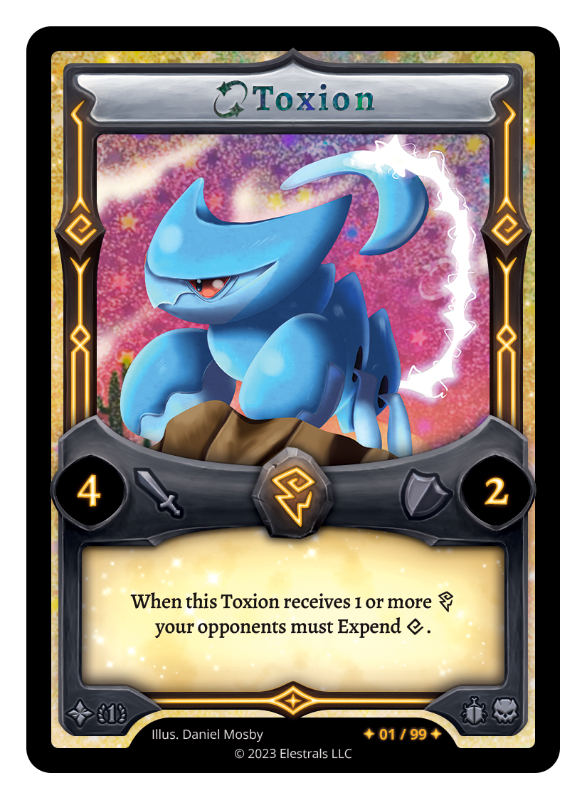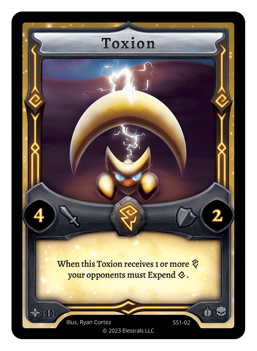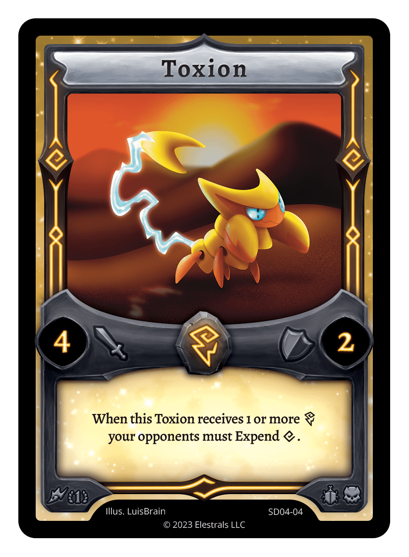 Toxion❮❯❮❯❮❯❮❯❮❯❮❯SD04-04SS1-02SD04-04XX/99SS2-008SST-SD029TypeElestralCostThunderElementsThunderAttack4Defense2Card TextWhen this Toxion receives 1 or more {T} your opponents must Expend {X}.SubclassesInsectoidEldritch