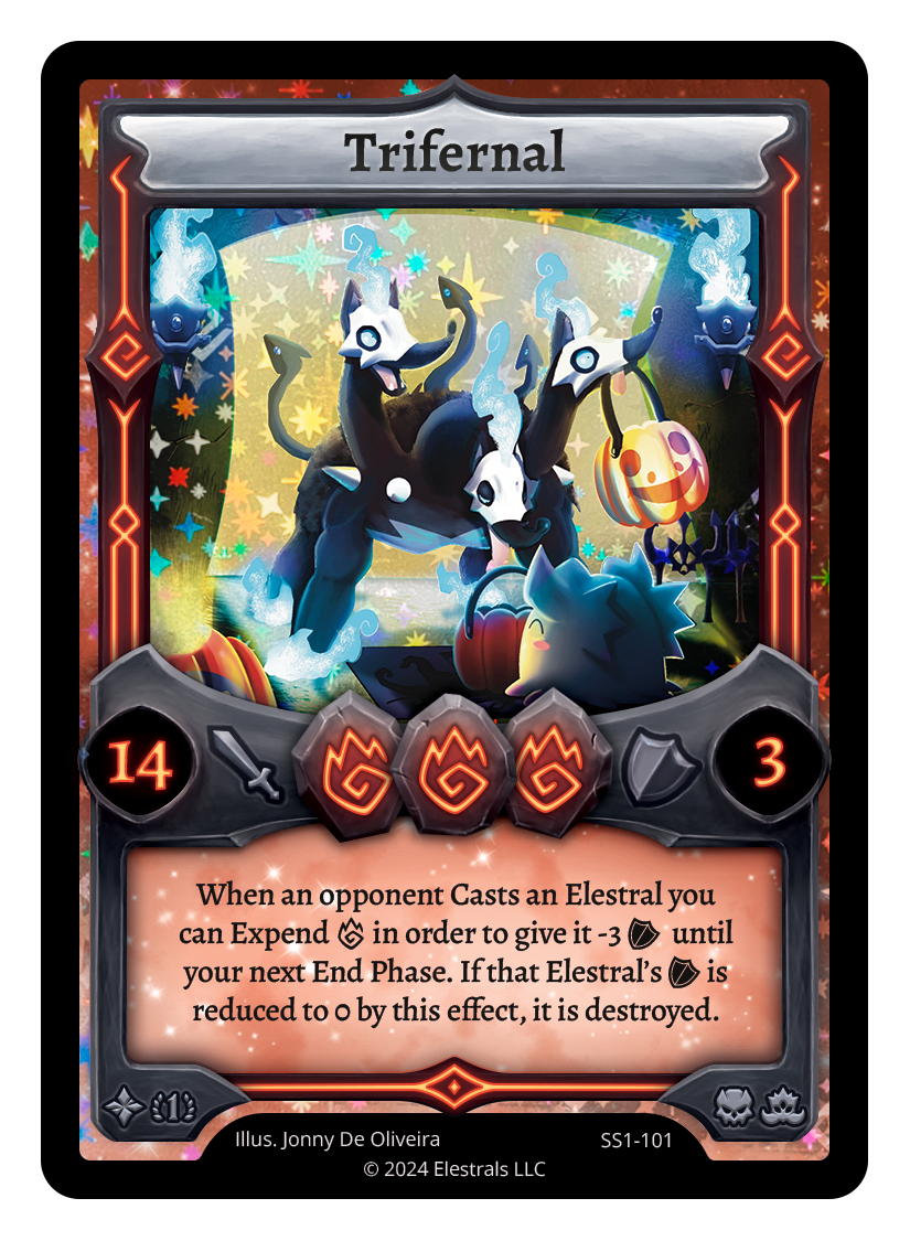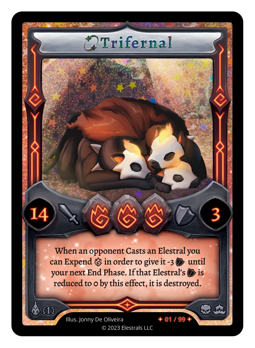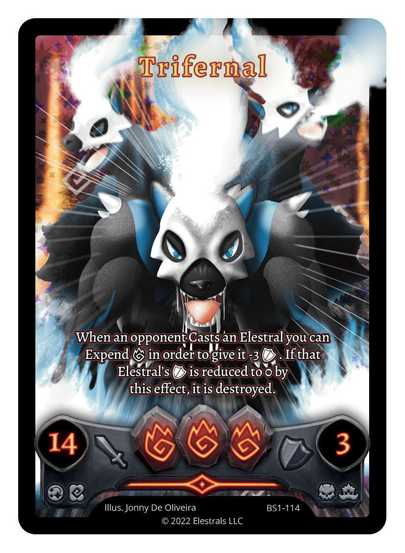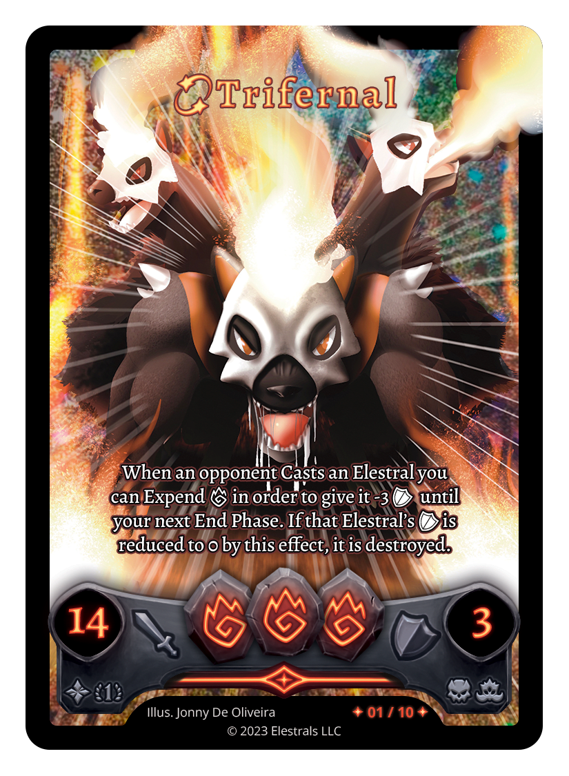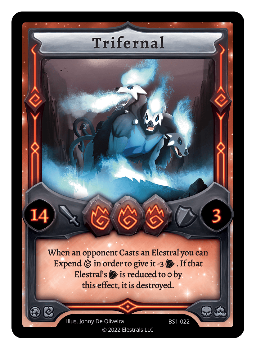 When an opponent Casts an Elestral you can Expend F in order to give it -3 {O} until the end of your next turn. If that Elestral's {O} is reduced to 0 by this effect, it is destroyed.