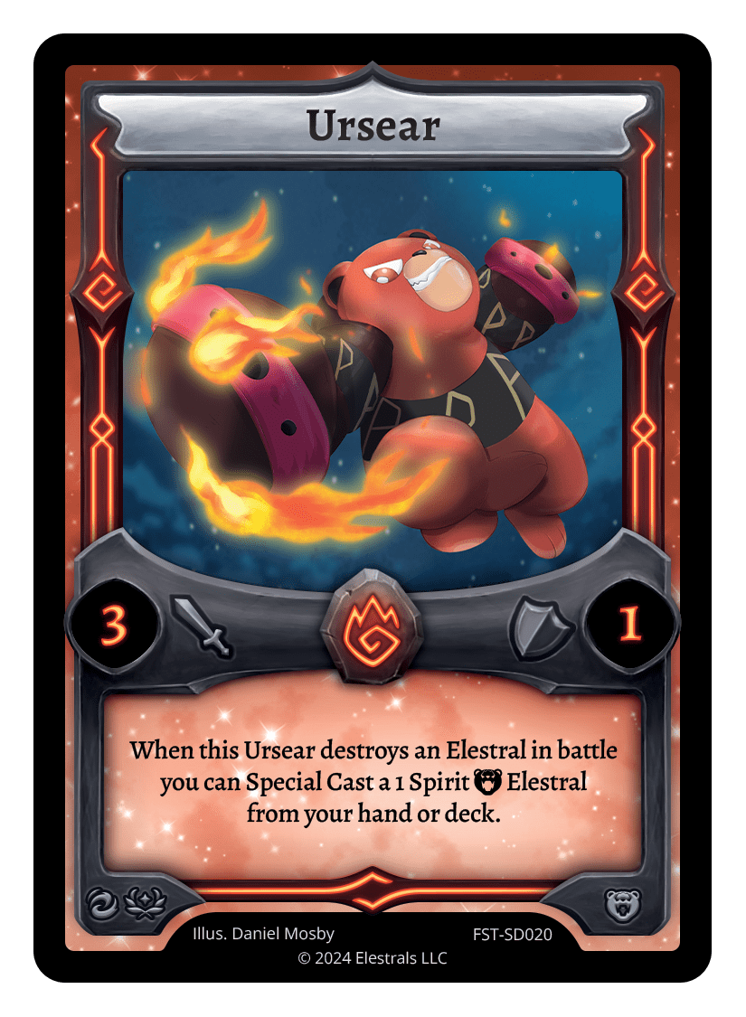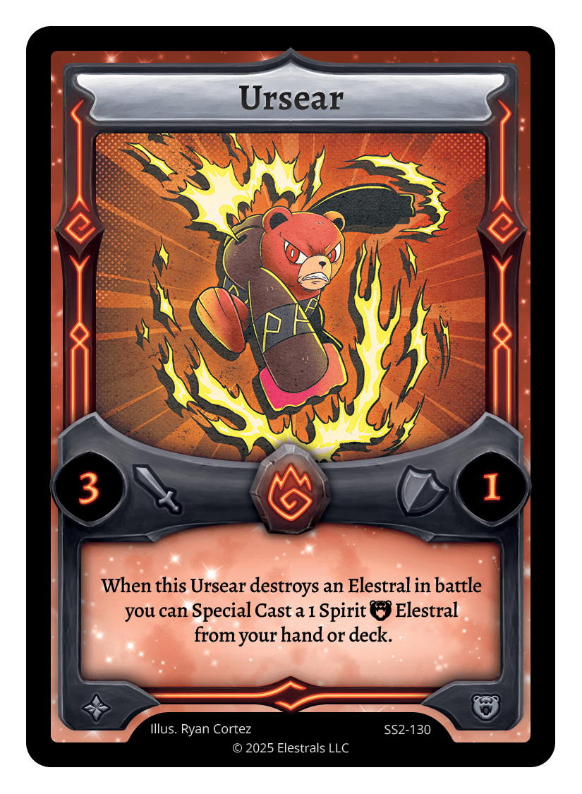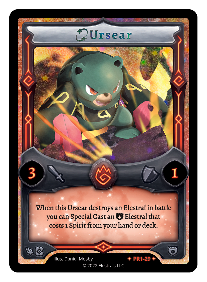 Ursear❮❯❮❯❮❯❮❯❮❯PR1-29BS1-025BS1-025FST-SD020SS2-130TypeElestralCostFireElementsFireAttack3Defense1Card TextWhen this Ursear destroys an Elestral in battle you can Special Cast a 1 Spirit {B} Elestral from your hand or deck.SubclassesUrsa