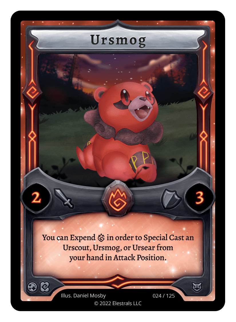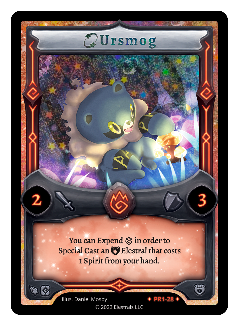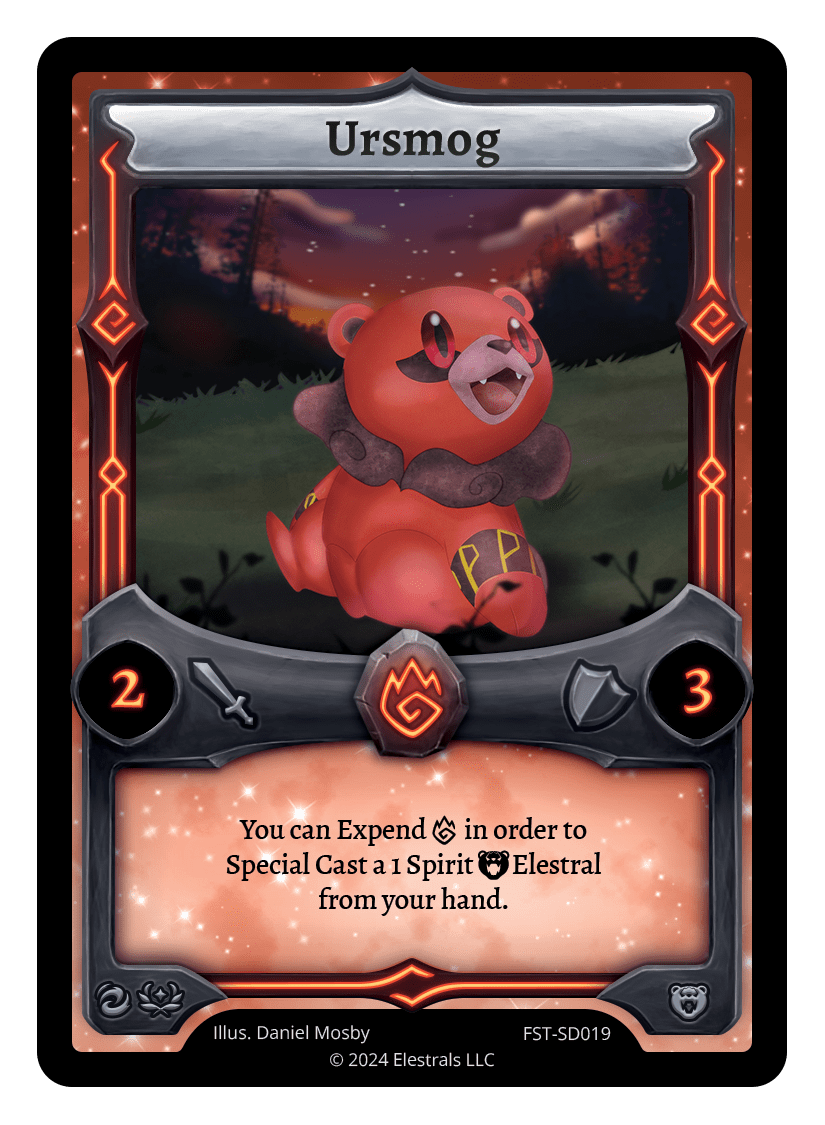 Ursmog❮❯❮❯❮❯❮❯BS1-024PR1-28BS1-024FST-SD019TypeElestralCostFireElementsFireAttack2Defense3Card TextYou can Expend {F} in order to Special Cast a 1 Spirit {B} Elestral from your hand.SubclassesUrsa