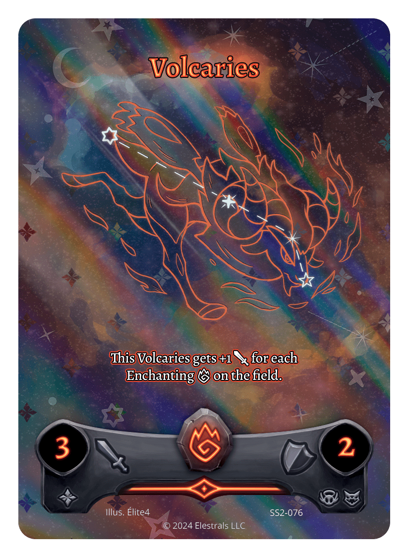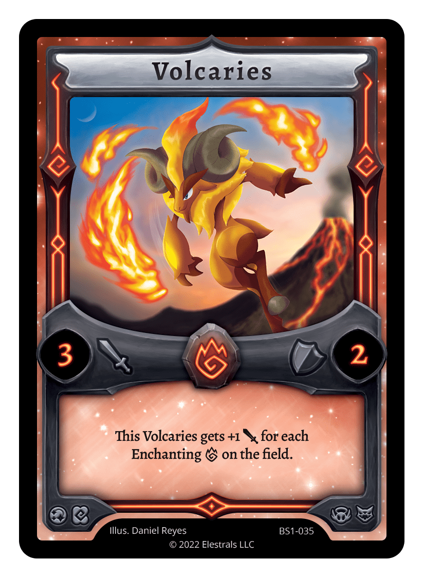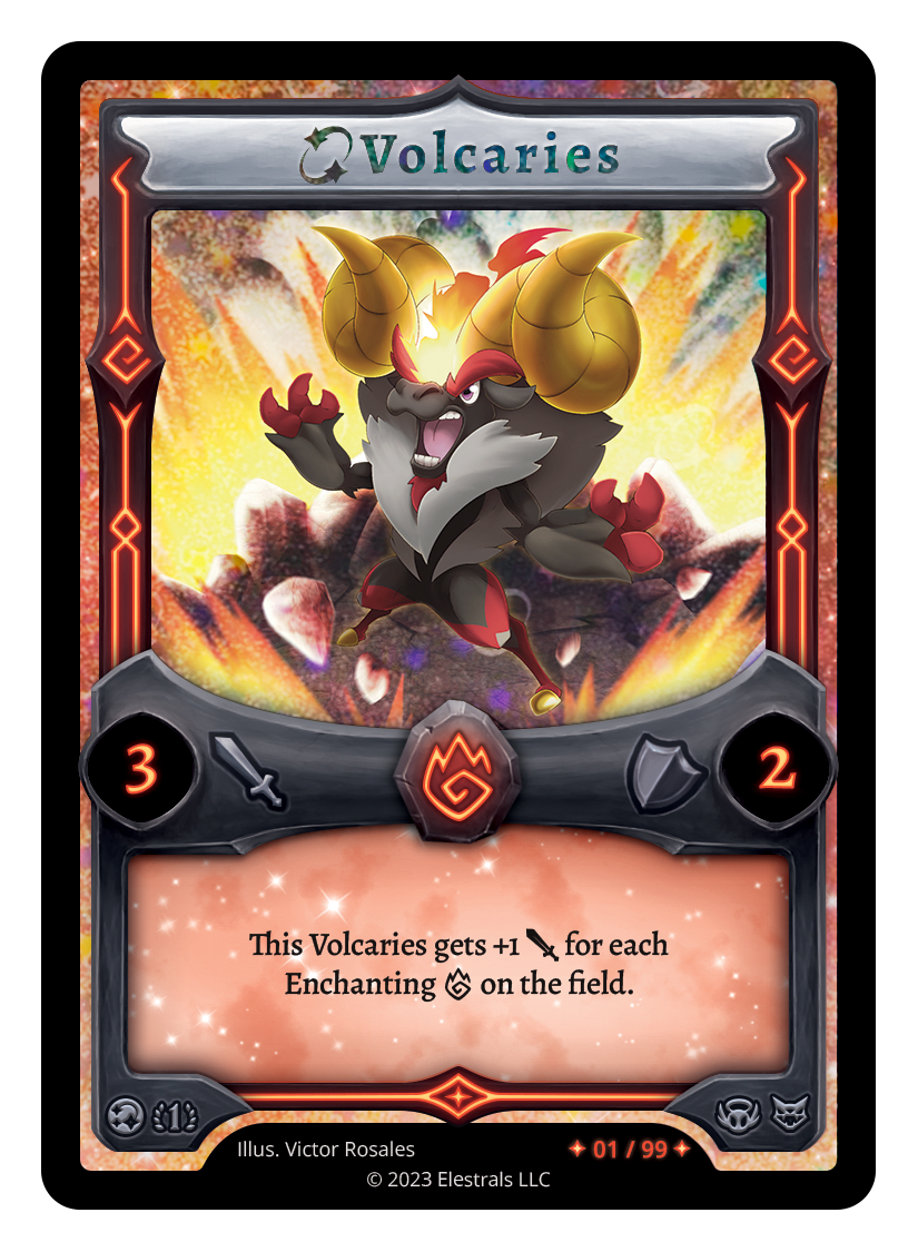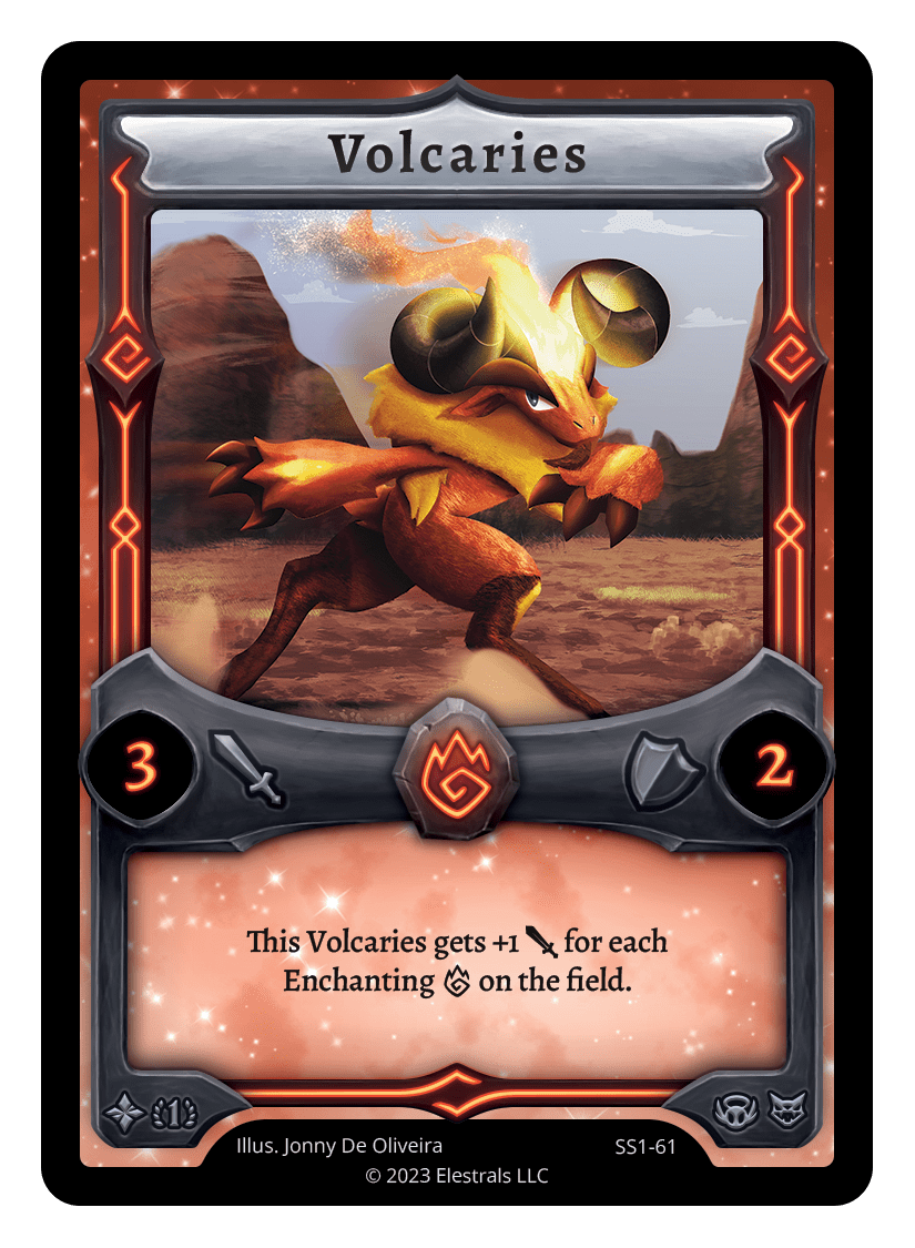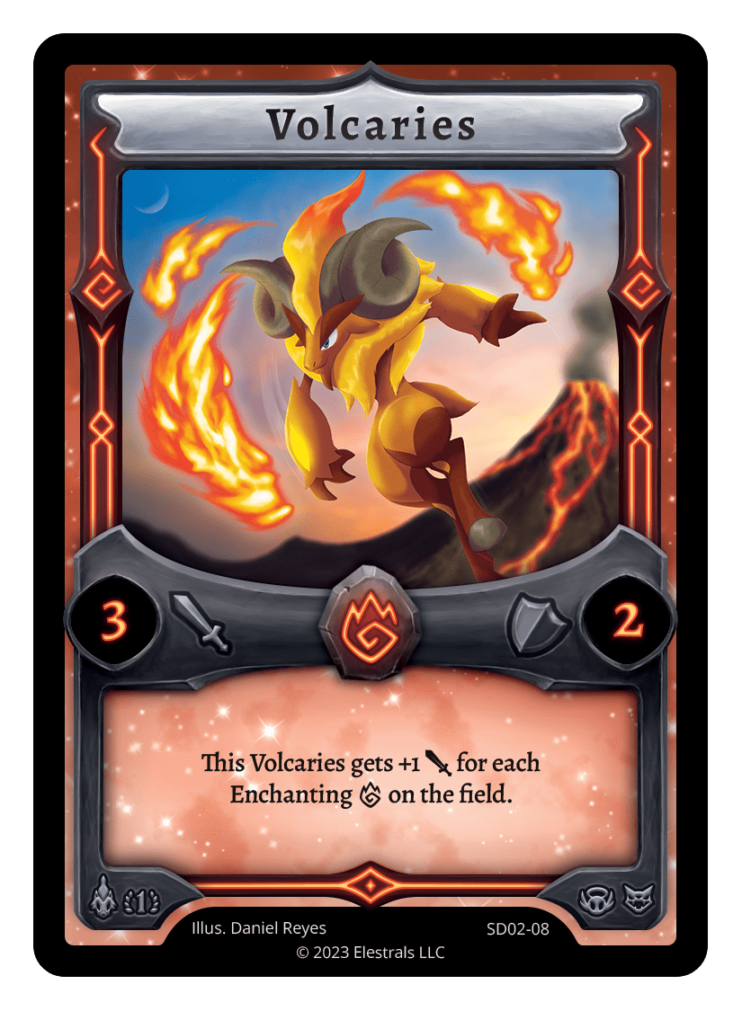 Volcaries❮❯❮❯❮❯❮❯❮❯❮❯❮❯SS1-61XX/99SD02-08BS1-035SD02-08BS1-035SS2-076TypeElestralCostFireElementsFireAttack3Defense2Card TextThis Volcaries gets +1 {J} for each Enchanting {F} on the field.SubclassesBruteEthereal