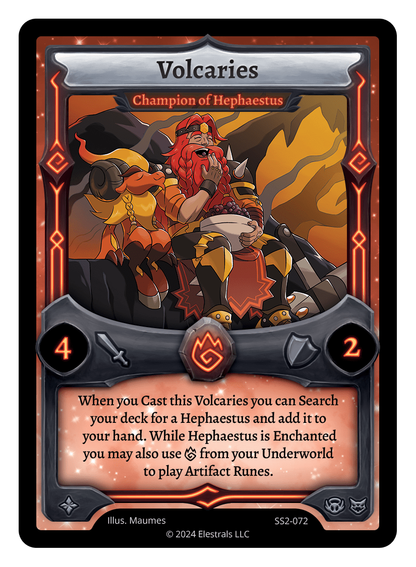 When you Cast this Volcaries you can Search your deck for a Hephaestus and add it to your hand. While Hephaestus is Enchanted you may also use {F} from your Underworld to play Artifact Runes.
