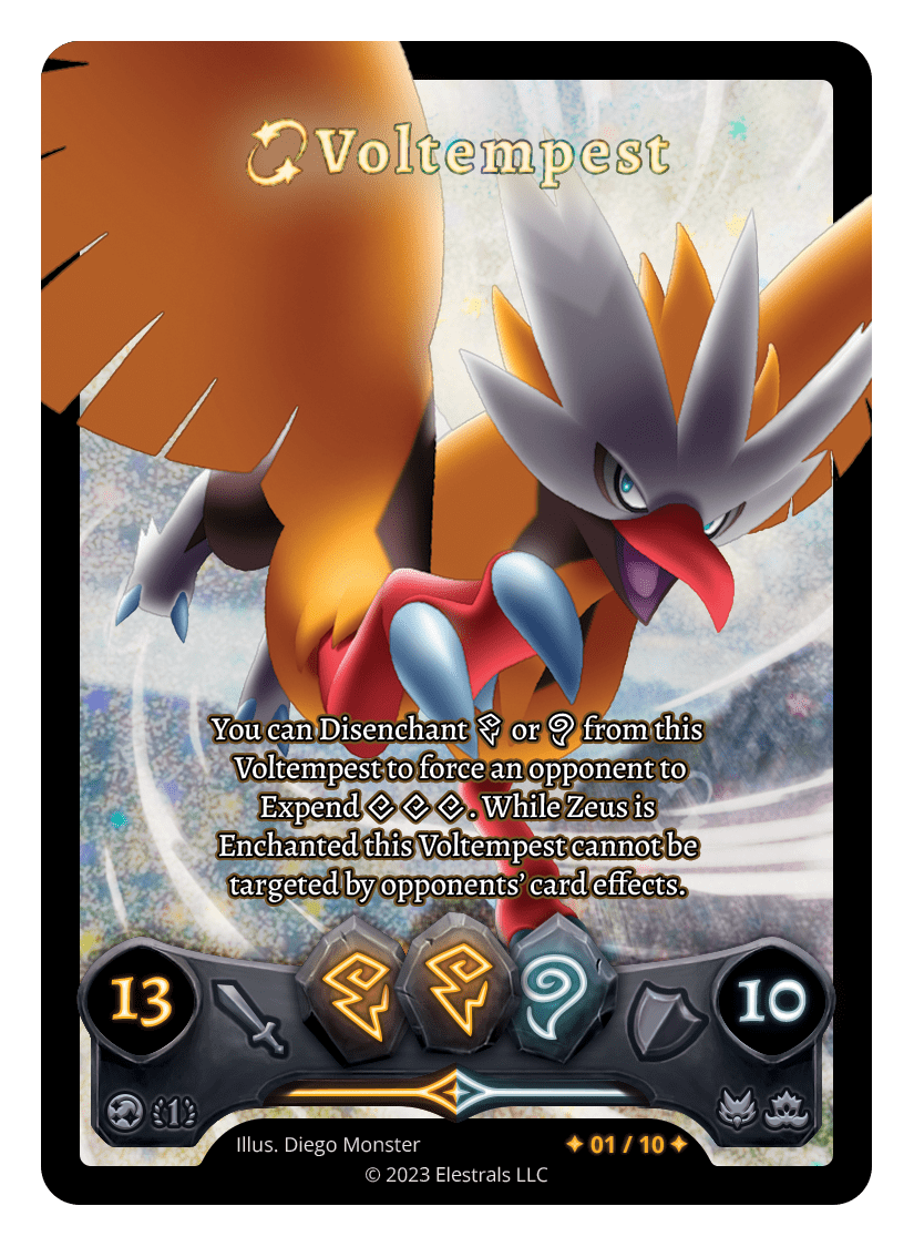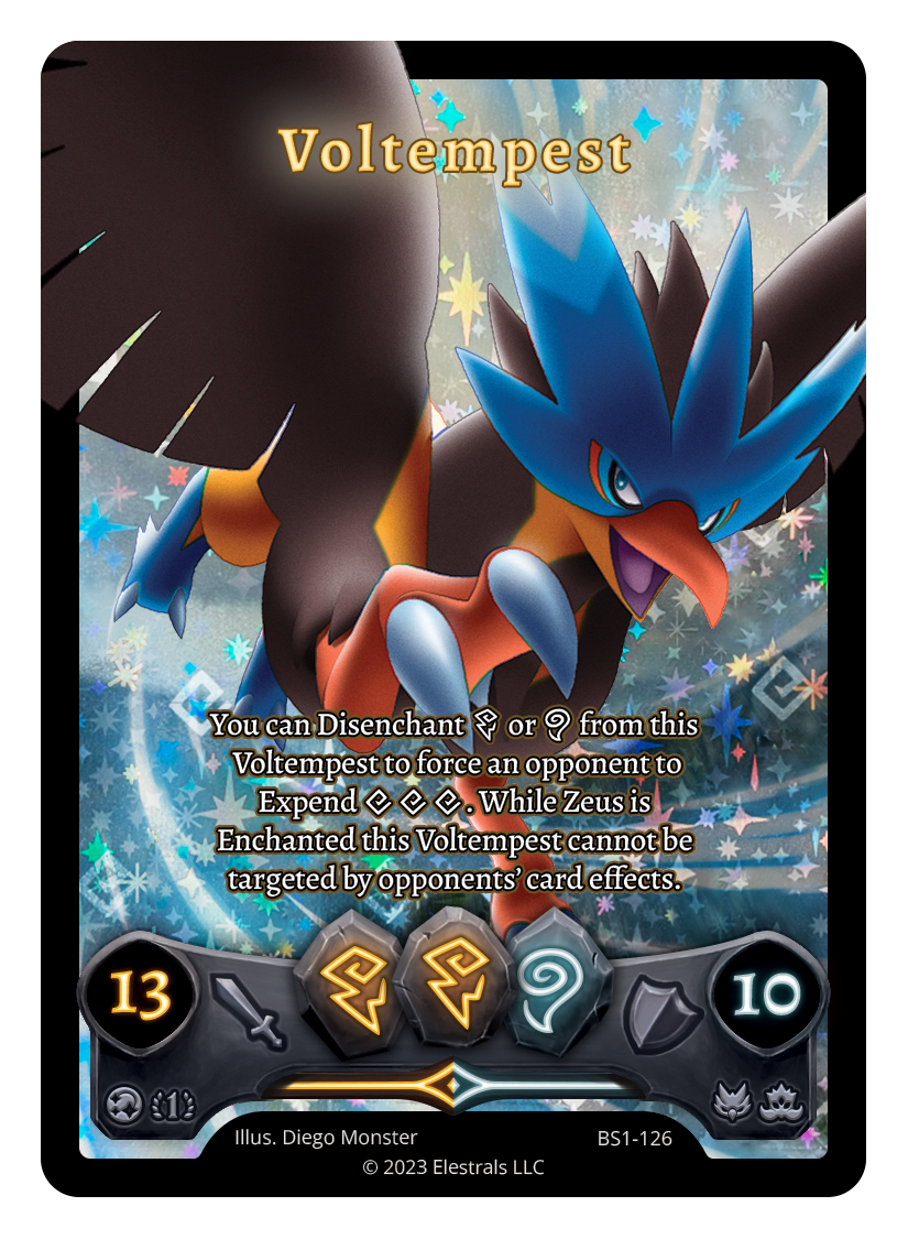 You can Disenchant {T}/{A} from this Voltempest to force an opponent to Expend {XXX}. While Zeus is Enchanted this Voltempest cannot be targeted by opponents’ card effects.