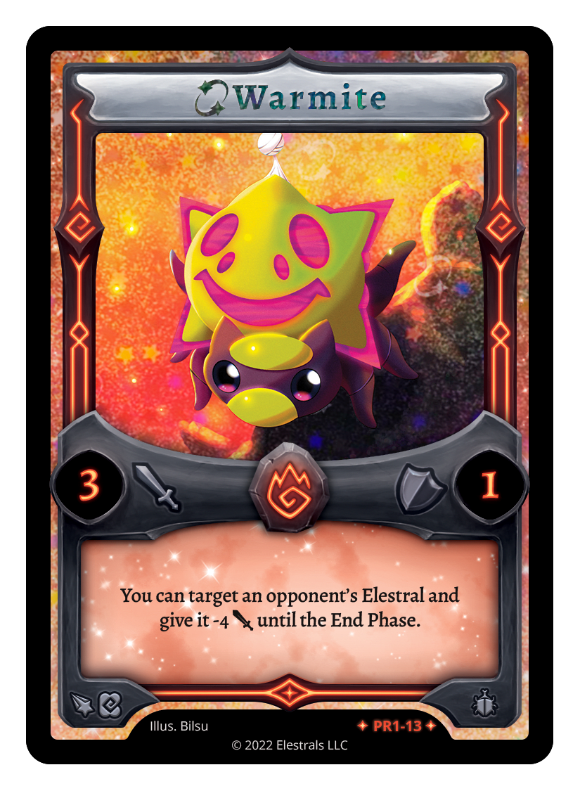 Warmite❮❯❮❯❮❯❮❯❮❯❮❯❮❯❮❯❮❯❮❯BS1-029SD04-12SD04-12SD03-11SD06-08SD03-11SD02-04PR1-13SD02-04BS1-029TypeElestralCostFireElementsFireAttack3Defense1Card TextYou can target an opponent's Elestral and give it -4 {J} until the next turn.SubclassesInsectoid