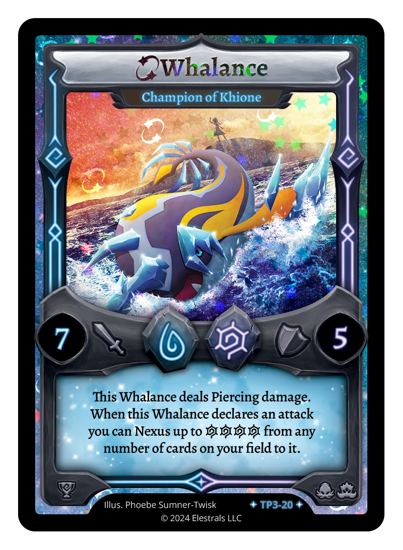 This Whalance deals Piercing damage. When this Whalance declares an attack you can Nexus up to {IIII} from any number of your cards on your field to it.