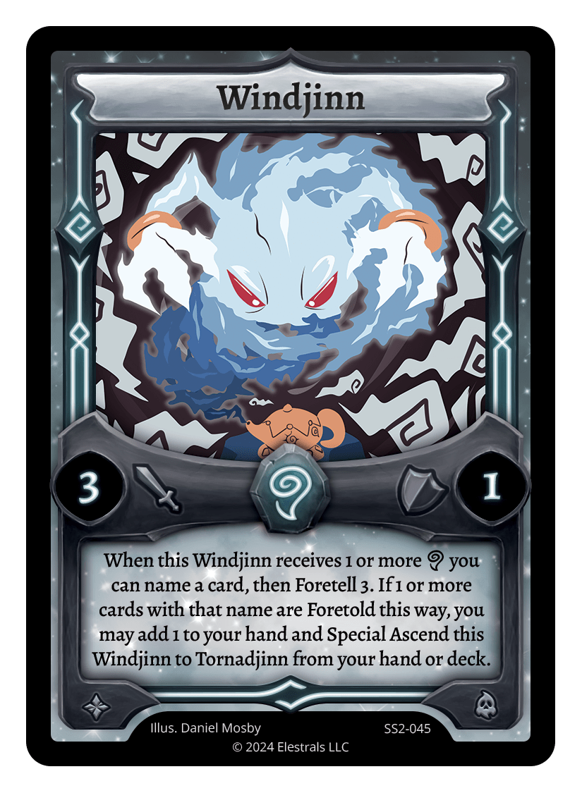 When this Windjinn receives 1 or more {A} you can name a card, then Foretell 3. If 1 or more cards with that name are Foretold this way, you may add 1 to your hand and Special Ascend this Windjinn to Tornadjinn from your hand or deck.