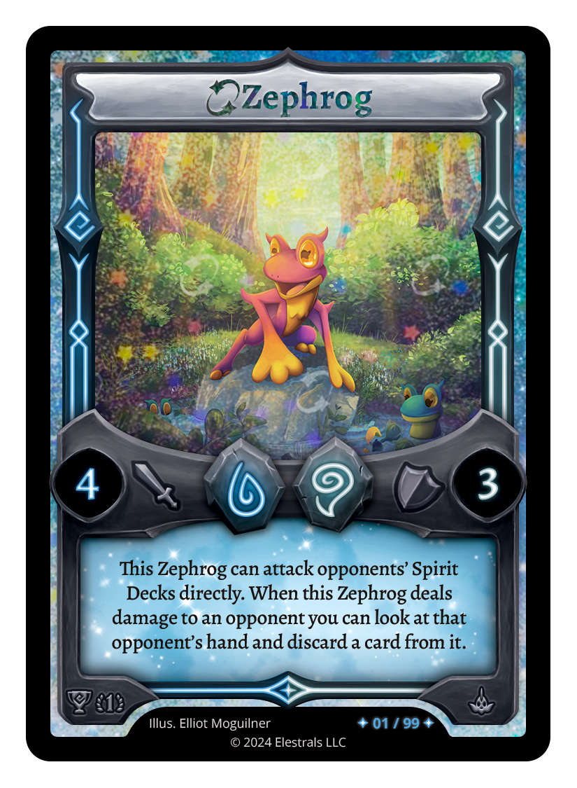 This Zephrog can attack opponents' Spirit Decks directly. When this Zephrog deals damage to an opponent you can look at that opponent's hand and discard a card from it.